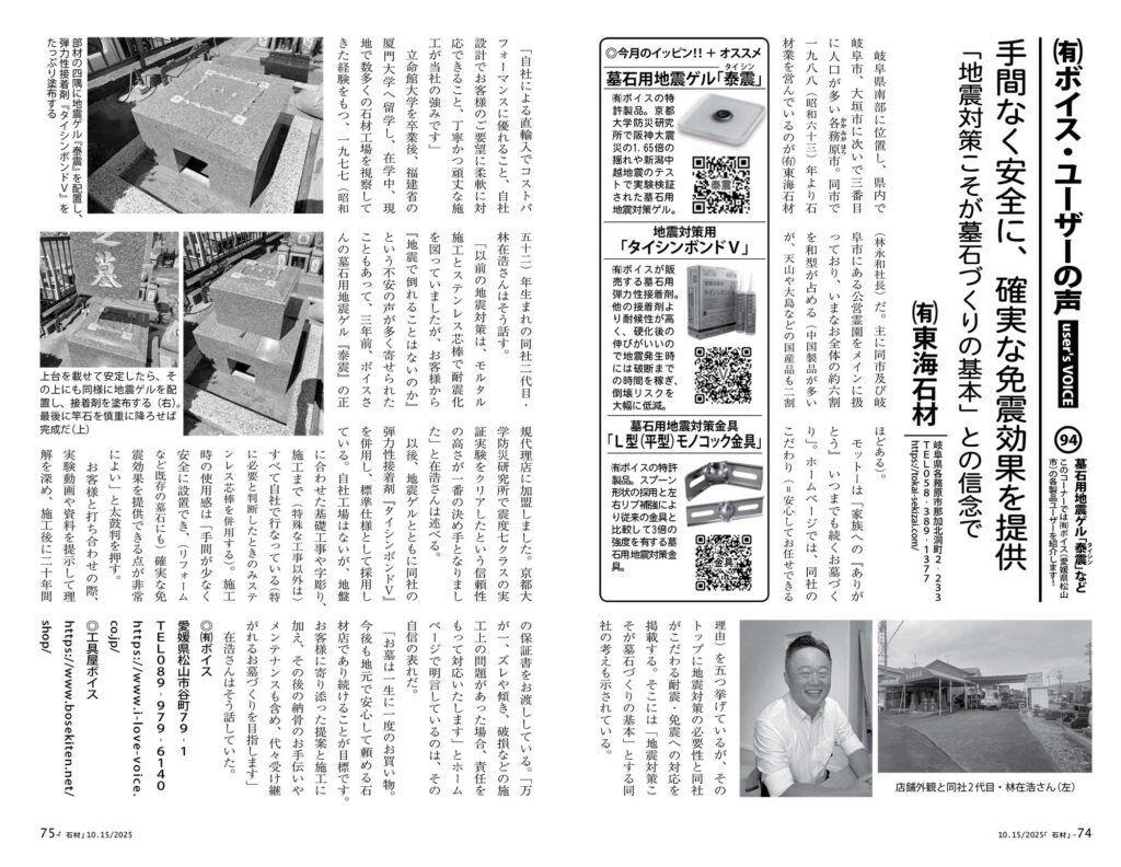「以前の、地震対策は、モルタル施工とステンレス芯棒で耐震化を図っていましたが、お客様から『地震で倒れることはないのか』という不安の声が多く寄せられたこともあって、3年前、ボイスさんの墓石用地震ゲル『泰震』の正規代理店に加盟しました。京都大学防災研究所で震度7クラスの実証実験をクリアしたという信頼性の高さが一番の決め手となりました。」(記事内抜粋)